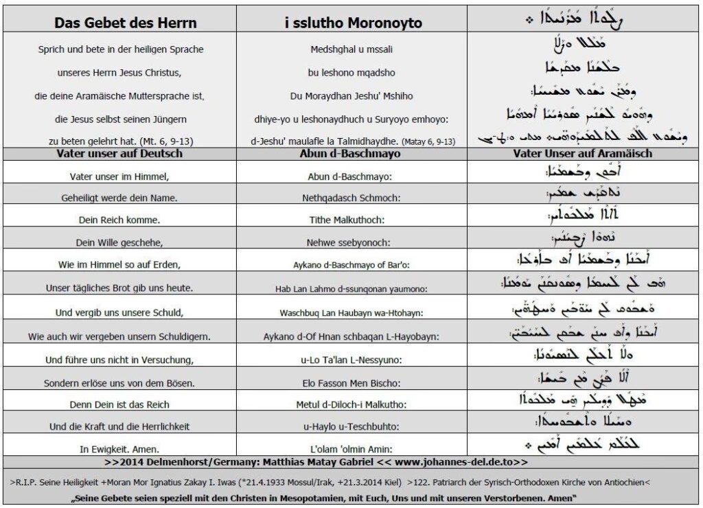 Aramäisch gilt als die Sprache Jesu. Doch zu seinen Lebzeiten wurde in Galiläa auch griechisch gesprochen, in Jerusalem aramäisch und hebräisch. Nach seinem Tod blieb seine Sprache über Jahrtausende erhalten. In mehreren christlichen Kirchen des Ostens wurde Aramäisch in den Gottesdiensten gesprochen und bis heute ist es Liturgiesprache geblieben.