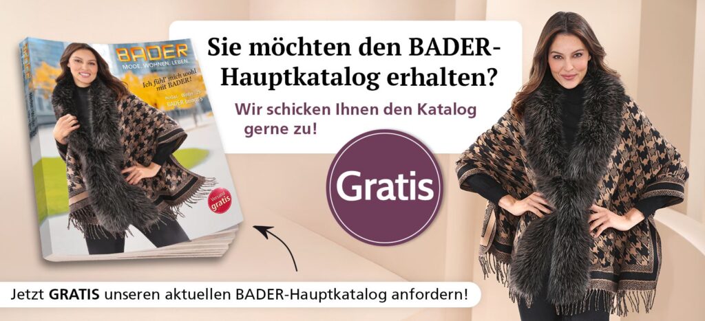A: Der aktuelle BADER-Hauptkatalog umfasst fast 1.000 Seiten, ist 4-farbig gedruckt und richtet sich an Privatkunden in Deutschland. Er erscheint zweimal pro Jahr und bietet eine Vielzahl von Angeboten aus den Bereichen MODE - WOHNEN - LEBEN, darunter ansprechende Mode in Normal- und Sondergrößen, stilvolle Möbel und Wohnaccessoires, aktuelle Multimedia-Markenartikel, ein ausgewähltes Schmuck-Sortiment sowie zahlreiche Angebote für Leib & Seele.