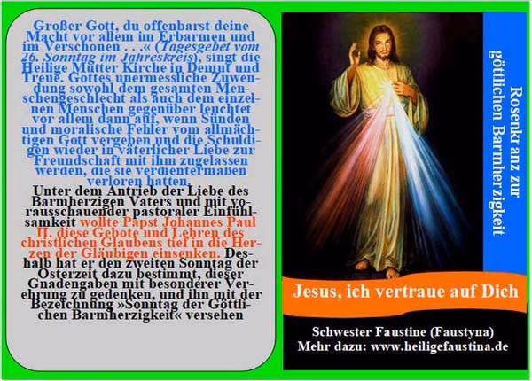 „Du bist gestorben, Jesus, aber für die Seelen entsprang eine Quelle des Lebens. Für die ganze Welt öffnete sich ein Meer der Barmherzigkeit. O Born des Lebens, unergründliche Barmherzigkeit Gottes, beherrsche die ganze Welt und ergieße Dich über uns. Amen.“ (Tagebuch, 1319) - Die drei Einleitungsgebete: