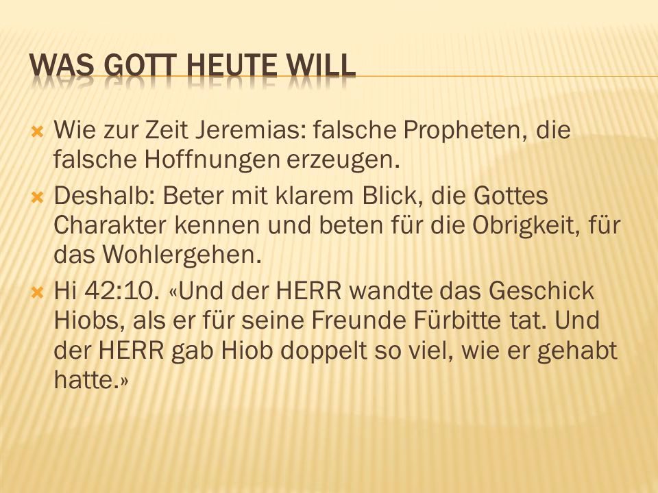 | VOLXBIBEL | für die Regierungen und die Parteien, die gerade an der Macht sind. Man nennt das auch „beten“. Dann können wir ein relaxtes, chilliges Leben führen, ein Leben, das von den Leuten respektiert wird. Wo Gott draufsteht soll auch Jesus drin sein. |