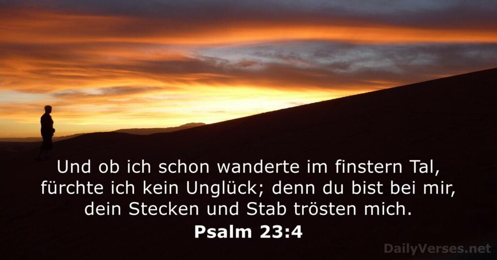 Der Vers über das „finstere Tal“ ist besonders kraftvoll in Zeiten von Leid, Krankheit oder Tod. Er erinnert uns daran, dass wir selbst in den dunkelsten Stunden nicht allein sind. Beten Sie diesen Vers, wenn Sie oder jemand, den Sie kennen, durch eine schwere Zeit gehen. Er bietet Trost und die Gewissheit, dass Gott uns selbst durch die Täler führt.