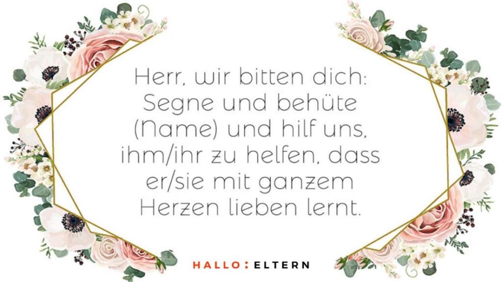 - Herr, unser Gott, begleite uns als Eltern mit Geduld, Liebe und der Weisheit, unserem Kind Geborgenheit und Vertrauen zu schenken. (Eltern)