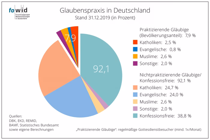 - Ja, in allen vom Religionsmonitor erfassten Dimensionen wie religiöse Erziehung, Gottesglaube und Gebetshäufigkeit ist ein Rückgang seit 2012 zu verzeichnen.