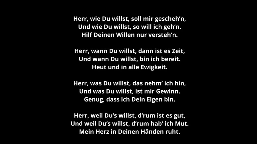 „Herr, wie Du willst, soll mir gescheh’n und wie Du willst, so will ich geh’n; hilf Deinen Willen nur versteh’n!“