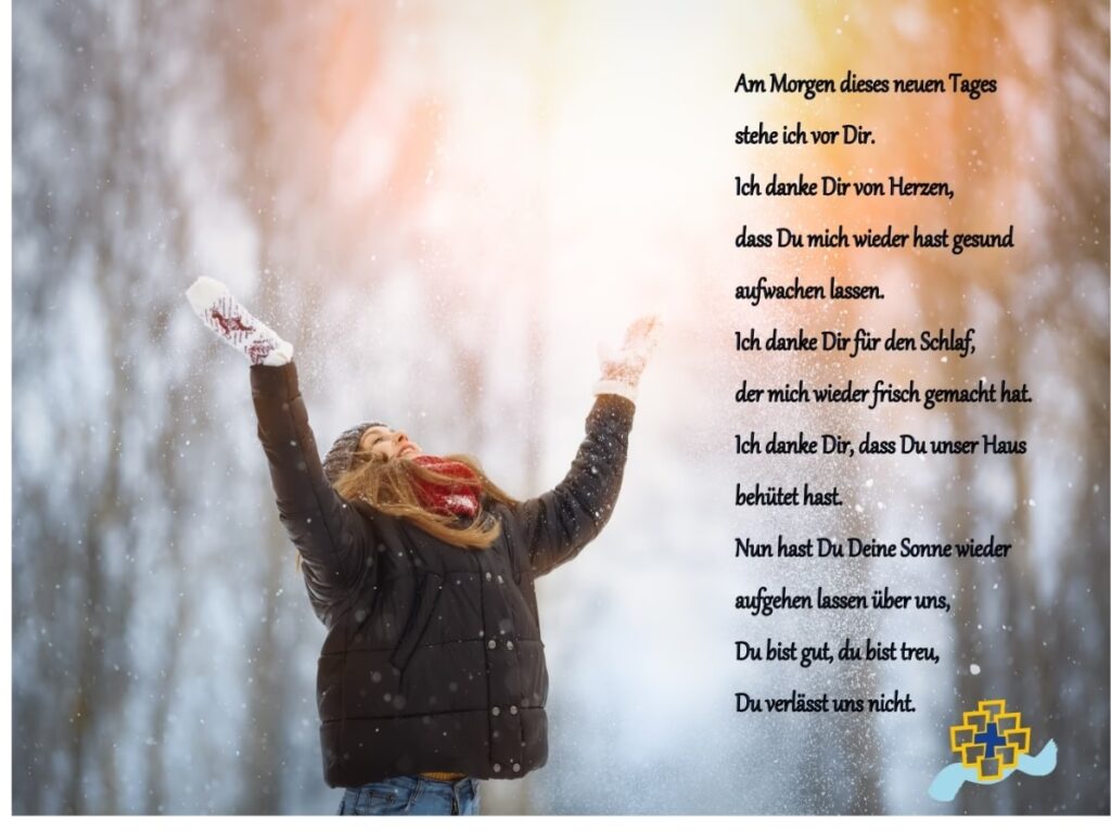 Vater im Himmel, Lob und Dank sei dir für die Ruhe der Nacht, Lob und Dank sei dir für den neuen Tag. Lob und Dank sei dir für alle deine Güte und Treue in meinem vergangenen Leben. Du hast mir viel Gutes erwiesen, lass mich nun auch das Schwere aus deiner Hand hinnehmen. Du wirst mir nicht mehr auflegen, als ich tragen kann. Amen.