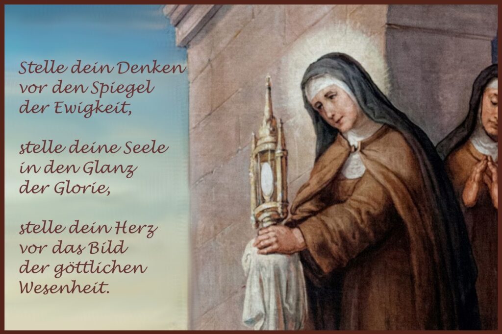 Gott der Barmherzigkeit, Du hast die heilige Klara mit der Liebe zur Armut inspiriert. Durch die Hilfe ihrer Gebete mögen wir Christus in der Armut des Geistes folgen und zur freudigen Schau deiner Herrlichkeit im Himmelreich kommen. Darum bitten wir durch unseren Herrn Jesus Christus, Deinen Sohn, der lebt und regiert mit Dir und dem Heiligen Geist, einem Gott, in Ewigkeit. Amen.