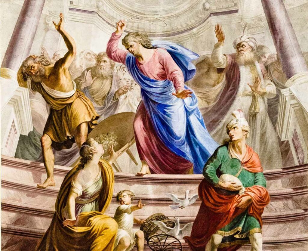 Wie jedes Jahr war Jesus zum Paschafest als Pilger nach Jerusalem hinaufgezogen. Er begibt sich in den prächtigen Tempel, das religiöse Zentrum des Judentums. Was er dort vorfindet, erfüllt ihn mit Zorn: Händler verkaufen Tiere für die Opferrituale, Geldwechsler tauschen römische Münzen gegen Tempelwährung – ein geschäftiges Treiben, das das Heiligtum zu einem Basar zu machen scheint. Die Bibel berichtet im Johannesevangelium (Joh 2,13-25) detailliert davon: