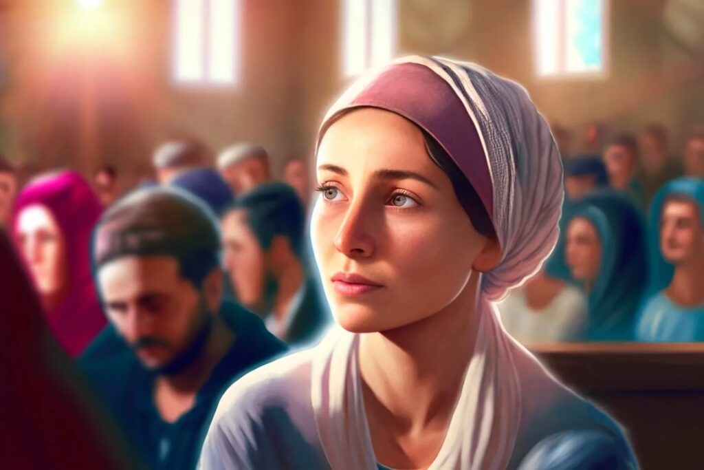 Für verheiratete jüdische Frauen ist es in vielen orthodoxen Kreisen üblich, ihr Haar in der Öffentlichkeit und insbesondere beim Gebet zu bedecken. Dies kann durch einen Tichel (Kopftuch), einen Snood (Haarnetz) oder sogar eine Perücke (Sheitel) geschehen. Die Haarabdeckung für Frauen wird als Zeichen der Bescheidenheit (Tzniut) und der Heiligkeit der Ehe betrachtet. Es ist eine Form des Respekts und der Hingabe, die ihre spirituelle Verbundenheit und ihren Status als verheiratete Frau unterstreicht.