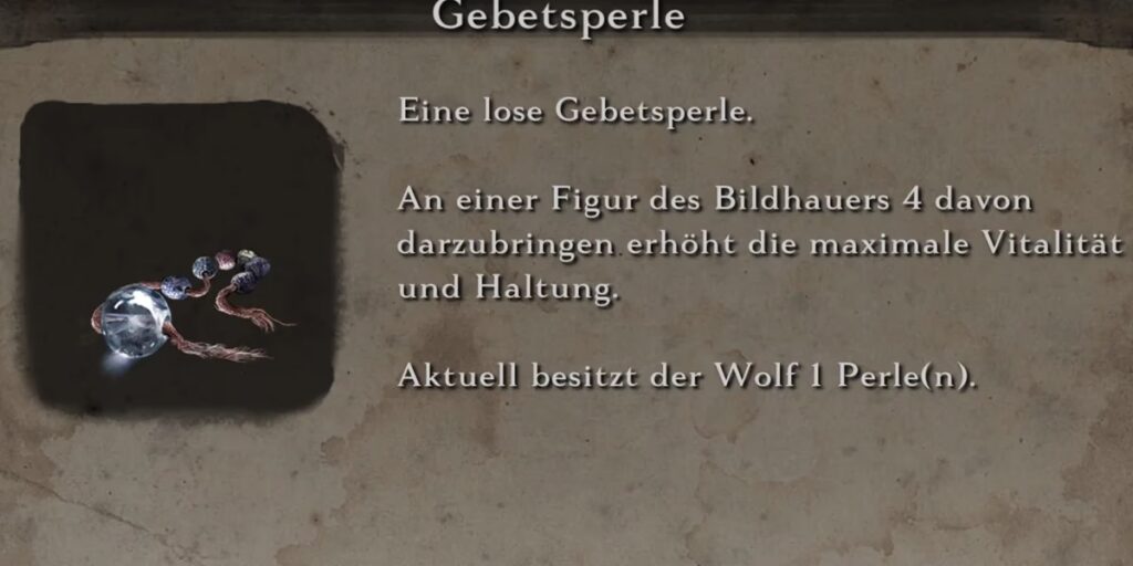 Jede gesammelte Gebetsperle trägt dazu bei, Ihre maximale Vitalität (Gesundheit) und Ihre Haltung (Stabilität gegen Angriffe, Füllrate Ihrer eigenen Haltungsleiste) zu erhöhen. Sobald Sie vier Perlen gesammelt haben, können Sie diese an einem Bildhauer-Idol zu einer Gebetskette schmieden. Diese permanenten Verbesserungen sind entscheidend, um die immer stärker werdenden Gegner im Spiel zu überleben.