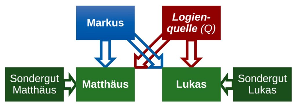 2. Logienquelle (Q): Neben dem Markusevangelium benutzten Matthäus und Lukas eine zweite gemeinsame Quelle, die sogenannte Logienquelle oder Spruchquelle, auch einfach Q genannt. Diese hypothetische Quelle bestand vor allem aus Gruppen von Einzelsprüchen Jesu und erklärt, warum Lukas und Matthäus gemeinsames zusätzliches Material über Markus hinaus haben, das sie noch dazu weitgehend in der gleichen Reihenfolge (wenn auch an unterschiedlichen Stellen) in ihre Evangelien eingebaut haben. Diese Quelle ist als eigener Text nicht erhalten, sie kann nur aus dem Lukas- und Matthäusevangelium rekonstruiert werden.
