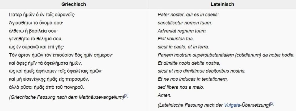 | Doxologie | (fehlt im Gebetstext, wird liturgisch hinzugefügt) | Denn dein ist das Reich und die Kraft und die Herrlichkeit in Ewigkeit. Amen. |