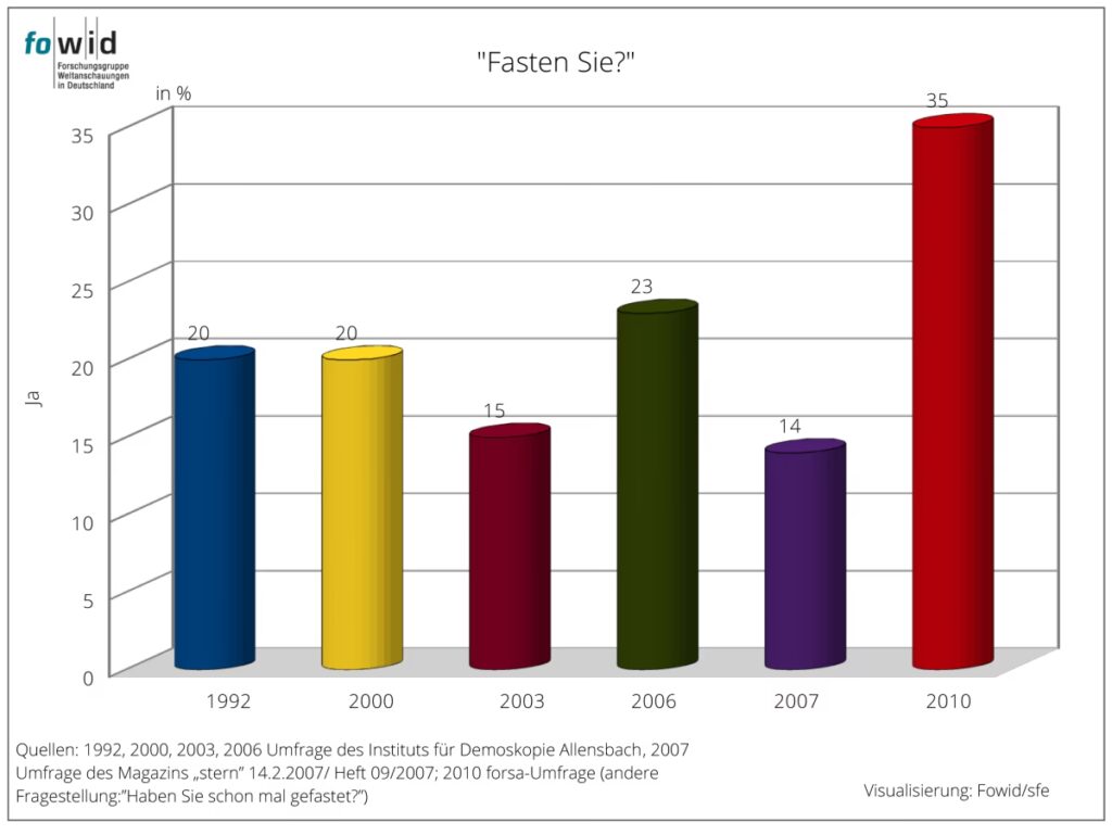 | Islam | Ramadan | Ein Monat; von Sonnenaufgang bis Sonnenuntergang kein Essen, Trinken, Rauchen, Sex; sehr konkrete Regeln | Spirituelle Pflicht, Reinigung der Seele, Stärkung der Beziehung zu Allah, Nächstenliebe, Selbstbeherrschung |
