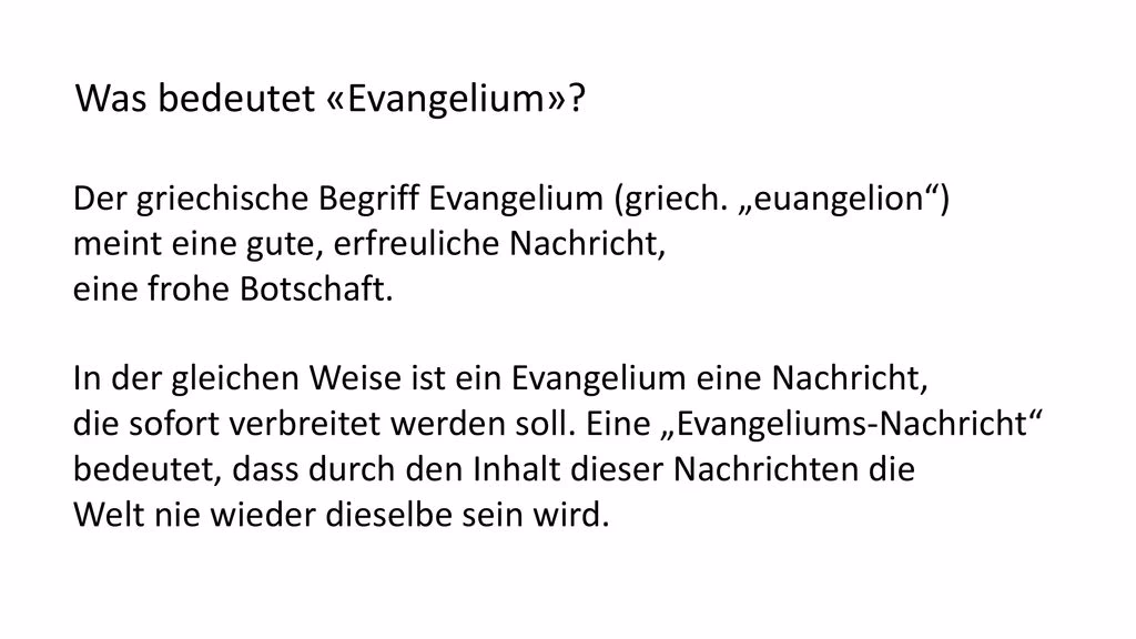 Das Wort „Evangelium“ stammt vom griechischen „euangelion“ ab, was „gute Nachricht“ oder „frohe Botschaft“ bedeutet. Im Neuen Testament wird damit die Botschaft von Jesus Christus bezeichnet, der durch seinen Tod am Kreuz und seine Auferstehung die Sünde der Welt gesühnt und den Weg zur Versöhnung mit Gott geöffnet hat. Es ist die zentrale Botschaft, die Christen seit über 2000 Jahren weitertragen.